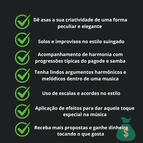 “Você curte o som da guitarra no pagode e Samba ? Já imaginou poder tocar os maiores sucessos no seu próprio estilo? No meu curso de guitarra no pagode, você vai aprender os riffs e solos que marcam presença nas melhores músicas de pagode, e ainda vai se divertir muito no processo!”